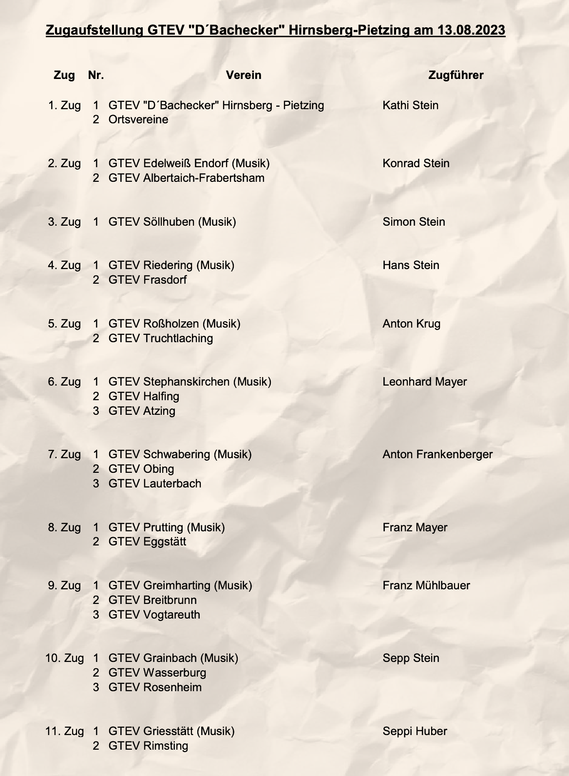Die Zugaufstellung seht Ihr hier unten. Wir bitten alle Vereine mit Musikkapelle um Stellung eines Zugtaferlbuam.