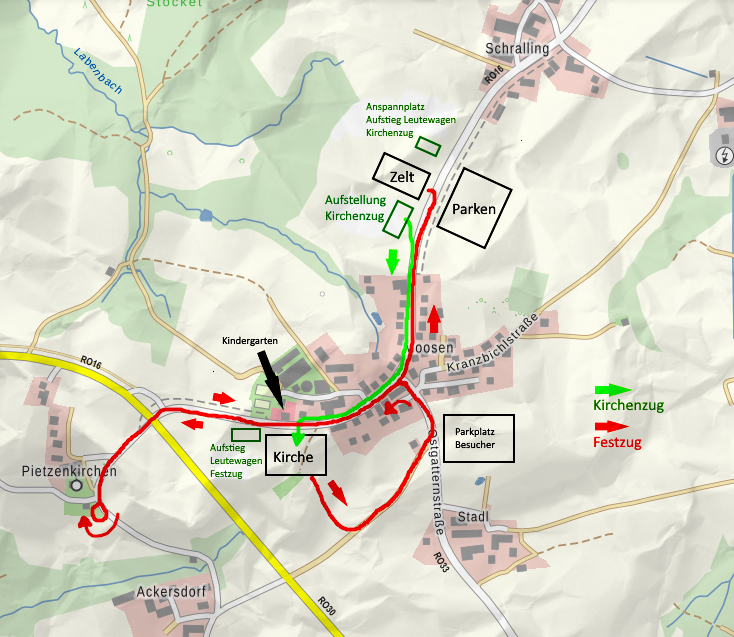 Leutewägen, die bereits am Kirchenzug teilnehmen, müssen bis spätestens 09.00 Uhr eingespannt sein. Die Mitfahrer können dort direkt neben dem Zelt aufsteigen.Leutewägen, die erst am Festzug teilnehmen, müssen um 10.45 Uhr am Kirchenplatz (vom Zelt her kommend durch Moosen bis zum Kindergarten) parat stehen. Motivwägen müssen um 10.45 Uhr an der Kreuzung in Moosen (vom Zelt her kommend) zum Einfädeln parat stehen.